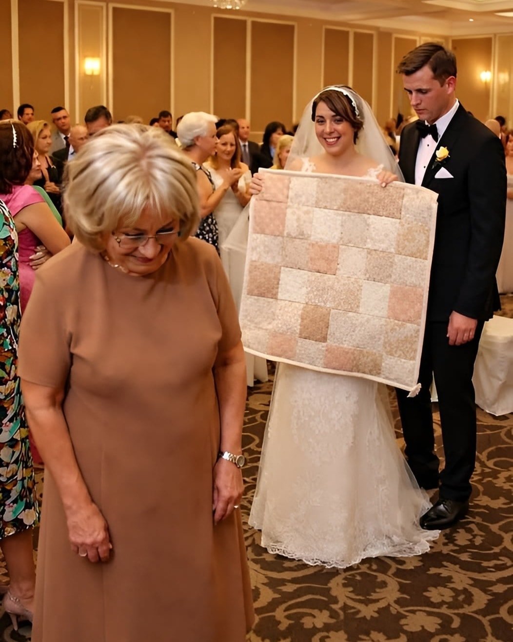 Ik wist dat ik ze geen dure gadgets of een envelop met geld kon geven. Dus deed ik wat ik kon — ik naaide een groot patchworkdeken. Ik verwerkte er een stukje van het kinderplaid van mijn kleinzoon in, stof van zijn schooluniform, het overhemd van mijn overleden man, kant van mijn sluier. In een hoek borduurde ik zorgvuldig: “Daniel & Olivia. Samen voor altijd”.