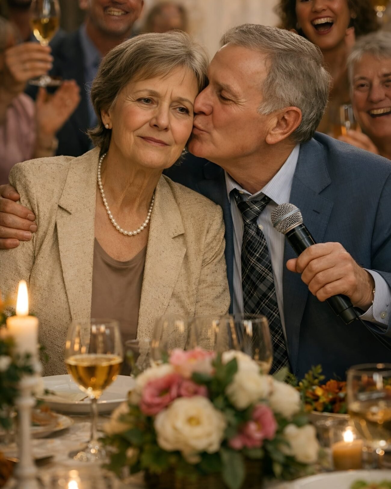 — Vrienden, — begon hij glimlachend, — jullie kennen allemaal mijn vrouw. Bescheiden, stil… soms zelfs te stil.
