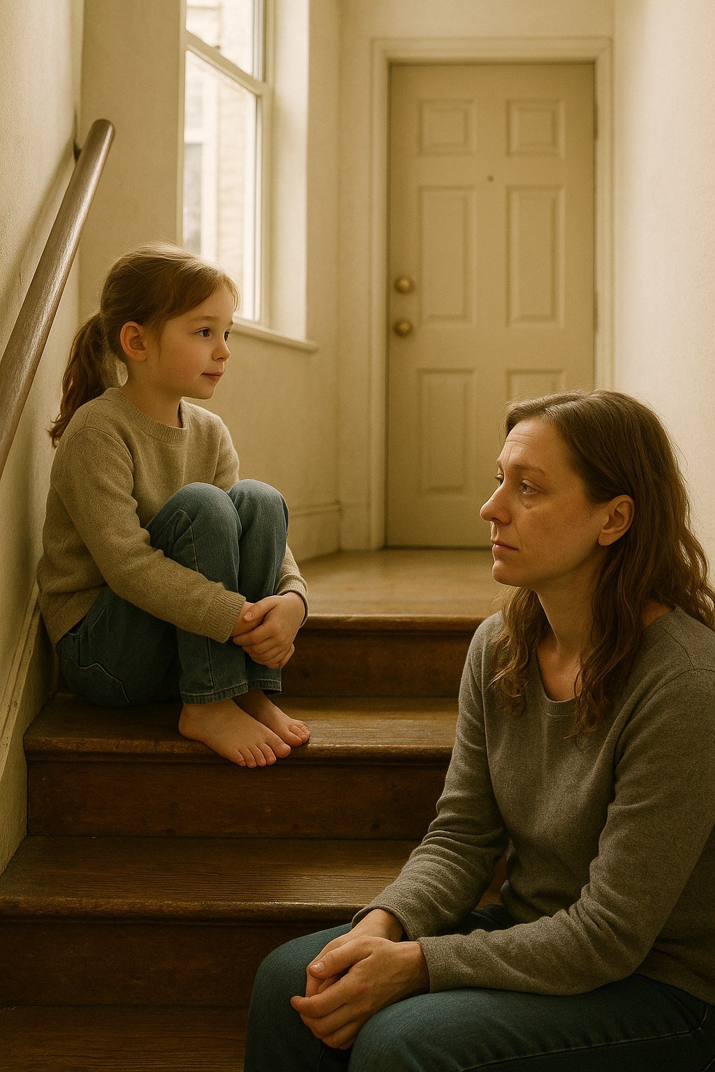 Lily zat op de trap, halverwege tussen begane grond en overloop, met haar knieën opgetrokken. Ze keek naar de voordeur, alsof er iemand stond. Haar hoofd was licht gekanteld, op die speciale manier die ze had als ze aandachtig luisterde.