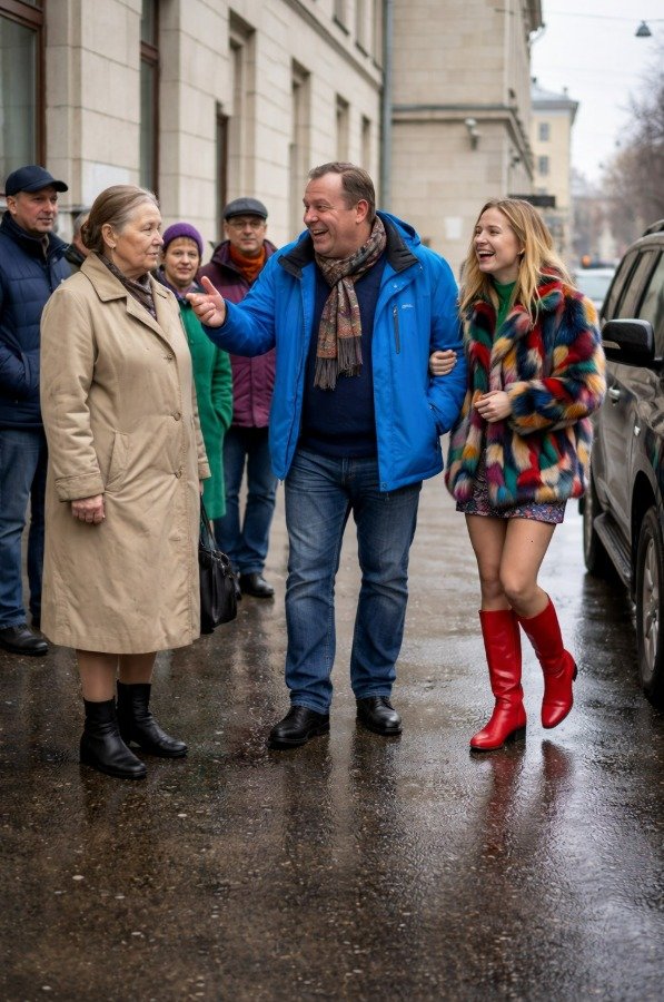 In de gang verscheen zijn nieuwe passie in een dure bontjas. Ze drukte zich tegen hem aan en lachte zacht. Hij trok haar dichterbij en zei met zichtbaar genoegen tegen zijn vrouw: