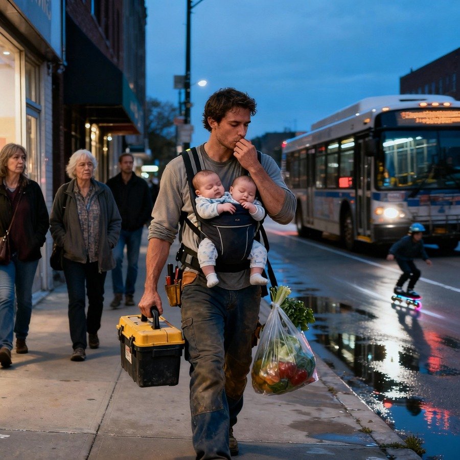 De stadslichten flikkerden tegen een gekneusde novemberhemel terwijl Daniel Brooks over het gebarsten trottoir sjokte, met de ene hand een gebarsten gereedschapskist vastgrijpend, de andere een dunne plastic boodschappenzak. Aan zijn borst waren zijn tweelingzonen, Matthew en Michael—zes maanden oud, zacht en slapend, hun kleine hoofden tegen zijn vervaagde werkjas gedrukt.