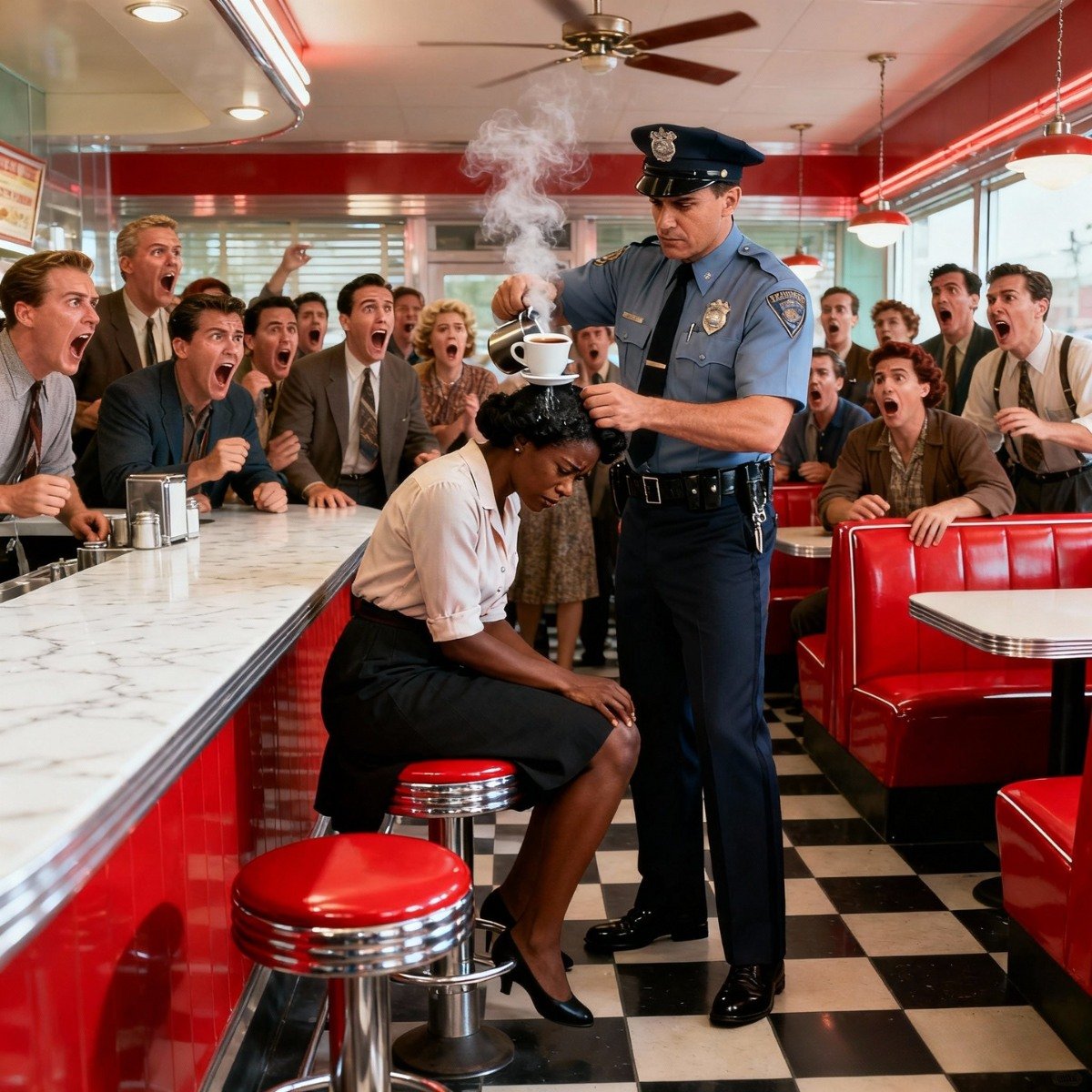 Aan de balie zat Agent Greg Daniels … een blanke agent van begin veertig, uniform licht gerimpeld, ogen moe maar scherp van arrogantie. Hij kwam al jaren elke ochtend naar dit restaurant. Iedereen kende zijn humeur, maar niemand daagde hem uit.
