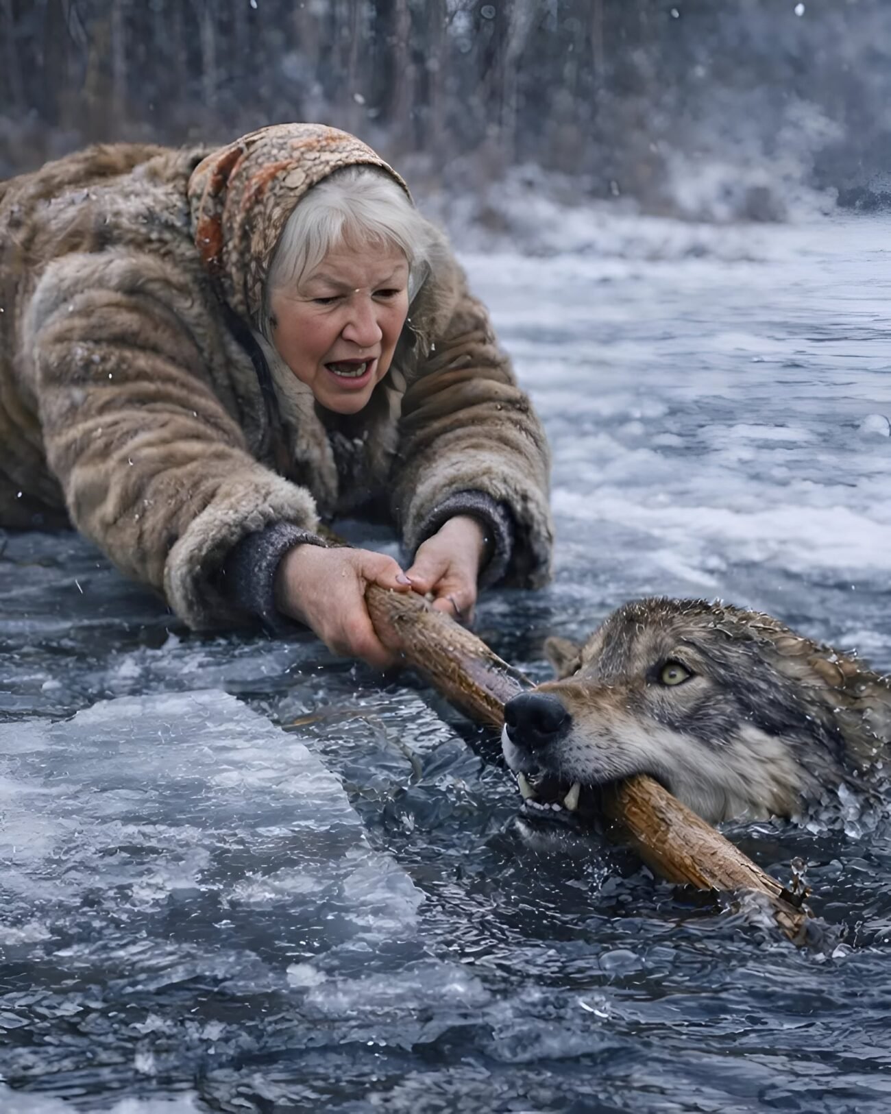 De wolf liet eerst zijn tanden zien, maar had geen kracht meer voor woede. Hij greep de tak met zijn voorpoten vast. De vrouw trok. Haar handen trilden, haar rug deed pijn, maar ze liet niet los. Het ijs kraakte opnieuw, water klotste over de rand en uiteindelijk kwam het zware lichaam van de wolf op het ijs terecht.